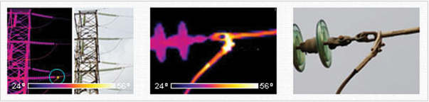 A bad connection on a transmission line shows up as a clear hot spot in the infrared image. A bad connection results in the current flow generates excessive temprature that can easily be detected with infrared thermography. If not attended to this connection might break, resulting in loss of power.